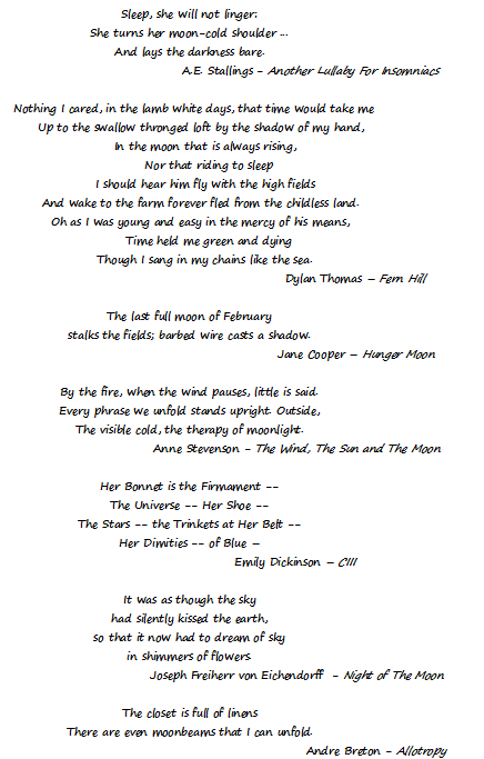Gladness is not the prevalent emotion I’ve found in moon-inspired poems. For beside exerting gravitational force on our waters to cause tides, the moon is also a force that leaves her marks in many poems. I could not choose just one so I’ll settle with couplets and stanzas of several much-admired poems that came my way and stayed – the one from Dylan Thomas has been with me for quite some time, Alicia Stallings’s makes formal meters appear illicitly daring. I can’t resist the juxtaposition of the stalking and therapeutic presence of the moon in the other excerpts, the rhythm of Emily Dickinson’s, nor let this post be unadorned by the prettiness of Joseph Eichendorff’s simile describing the shimmering light. And I wonder how it feels to unfold moonbeams.